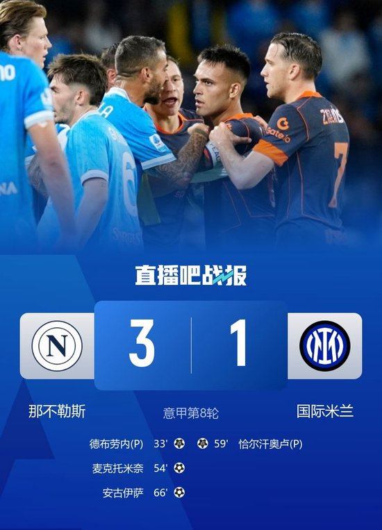 直播吧10月26日讯 北京时间0:00,意甲第8轮那不勒斯vs国际米兰。上半场,阿切尔比送点,德布劳内点射后拉伤被换下场!下半场,麦克托米奈凌空斩;恰尔汗奥卢点射扳回一球;安古伊萨再下一城!最终,那不勒斯3-1击败国米,终结国米4连胜!暂时登顶意甲榜首!