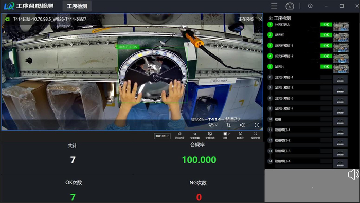以智能补光灯的装配为例,灯罩装配需依次安装反光杯、滤光片、格栅等零部件,其间穿插多道打螺钉工序,漏掉一个步骤,都可能导致灯罩密封不严、进水起雾,顺序错误则会影响效率和质量。如今,依托观澜大模型,通过实时视频,逐步分析装配流程,监测每个动作的执行与顺序,线边显示屏实时反馈工序是否合规,如同为每位员工配备了“SOP操作规范指导”。