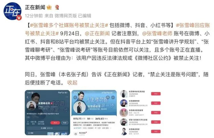 还记得一个月前,张雪峰的抖音、快手、微博、B站等多平台账号被同时禁止关注,如此规模的“团灭”,几乎前所未有。