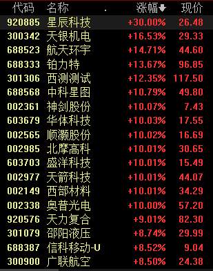 具体来看,商业航天全线爆发,盛洋科技、天箭科技、顺灏股份、神剑股份等10股涨停。